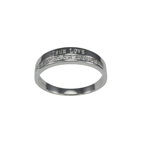 Say you are the one for her with this True Love ring. The band rings is engraved with the words "True Love" over a row of 15 diamond cubic zirconia. The ring is made of CAREFREE sterling silver with a polished finish. A matching "True Love" ring for him is available ASIN (556512.0199) *CAREFREE Sterling Silver is Rhodium plated which gives the highest resistance to tarnishing and also adds an expensive platinum look to our jewelry.